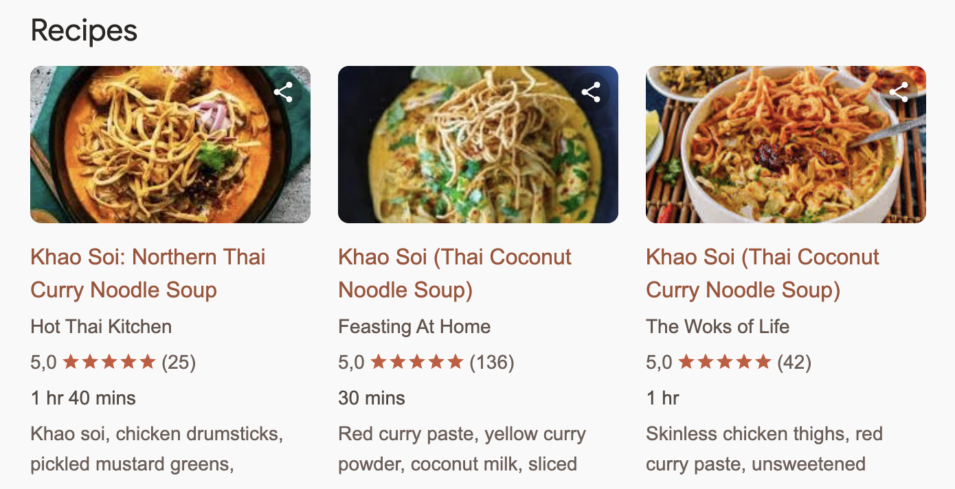 Tagine is able to magically extract recipes from most blogs regardless of how the recipe is presented to the user. At first, this sounds like a parsing nightmare with me having to maintain hundreds of site-specific parsers. Luckily, Google has kinda solved this problem for me! They incentivise recipe blogs to include their recipe as metadata to be pulled up the Google rankings and be presented to users as a shiny card.