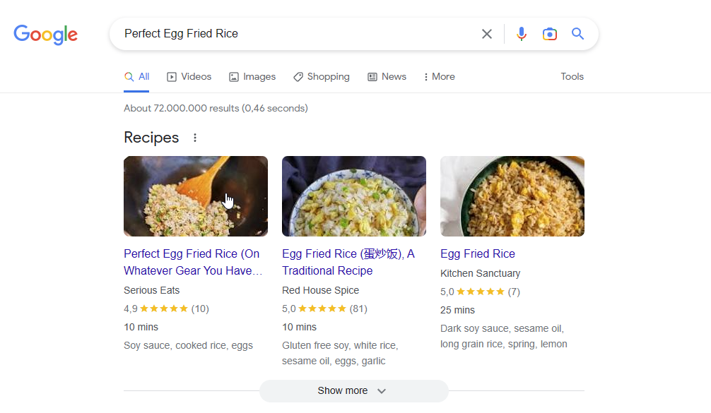 }The JSON-LD schema gives us a clear picture of all of the fields that make up a recipe and allows us to parse the data using a number of libraries. Websites are incentivised to provide this data to allow search engine scrapers to get a better understanding of their pages and rank them higher. This data is also used by google to provide richer previews of the most relevant results like the one pictured below.