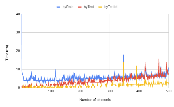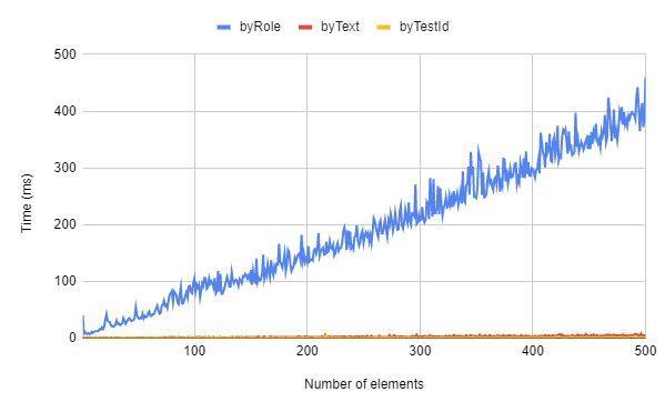 This chart shows how long it takes to select one element as the number of rendered elements grows. As we can see, the execution time for byText and byTestId remain relatively constant as the number of elements grows. The problem however is that byRole queries grow linearly.